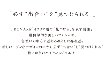 ”TROVARE” イタリア語で「見つける」を表す言葉。幾何学的な美しいフォルムや、色使いの中心に感じる凜とした存在感。新しいモダンなデザインの中から必ず ”出合い” を ”見つけられる”他にはないハイセンスジュエリー